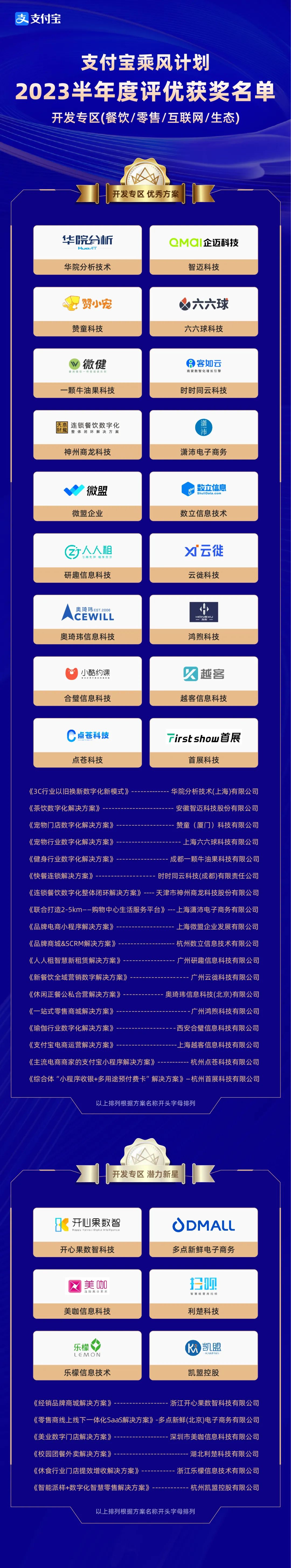 2023年支付宝“乘风计划-数字化解决方案加速器”半年度评优历时四个月,共征集400+数字化解决方案,覆盖餐饮、零售、酒店、商圈、租赁、宠物等众多行业。